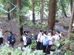 和気藹々と昼食を食べた後は、筑波実験植物園の見学。あらかじめ配られたワークシートに沿って班ごとに園内の植物を観察しました。珍しいシダやコケ等の植物、絶滅危惧種の植物の数々を興味深く見て回り、口々に「楽しかった」との感想をもらしていました。