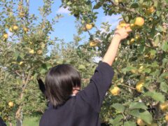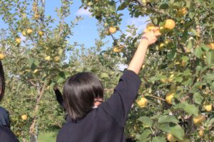 2日目のテーマは青森”深”探究。各自が選んだプログラムによって行く先が変わります。弘前の伝統文化である【弘前ねぷたまつり】、地域産業である【りんご産業】、伝統工芸である【こぎん刺し】、ブナから作られる新しい工芸品の【ブナコ】と地場産業。東北ならではの探究テーマの下、それぞれの文化の更なる可能性や未来について考える機会になりました。ホテルに戻る前に、4コース全員揃って向かったのはりんご園。【トキ】と呼ばれる旬の青りんごをもぎました。