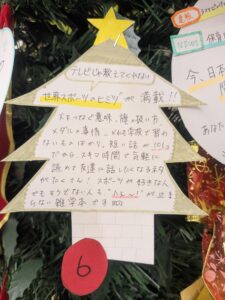 まず、クリスマスツリーに飾られている手作りのPOP(紹介カード)を読みます。