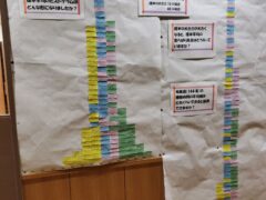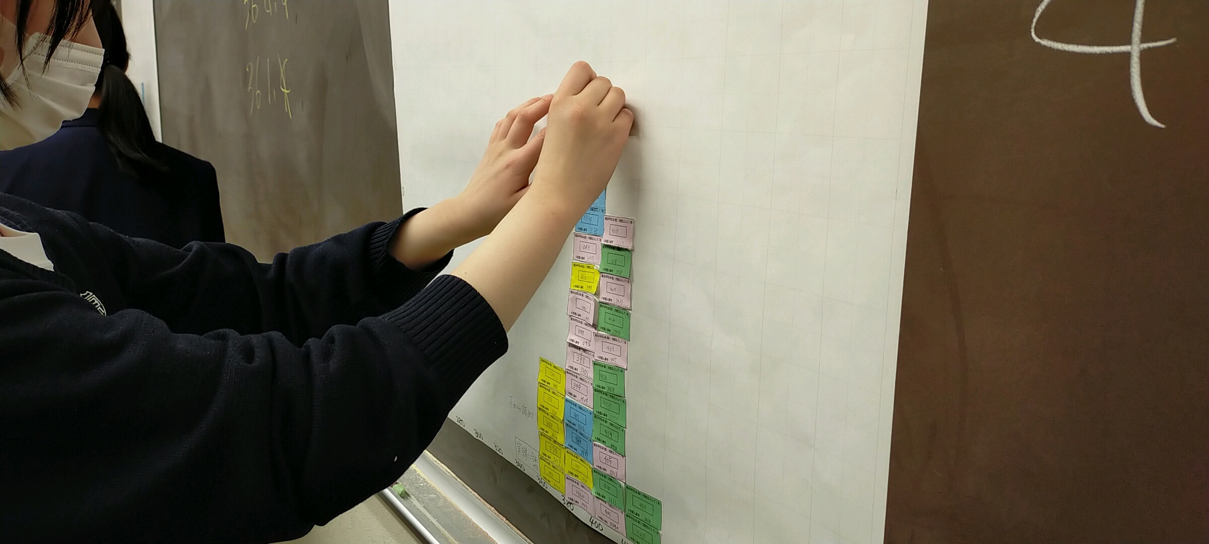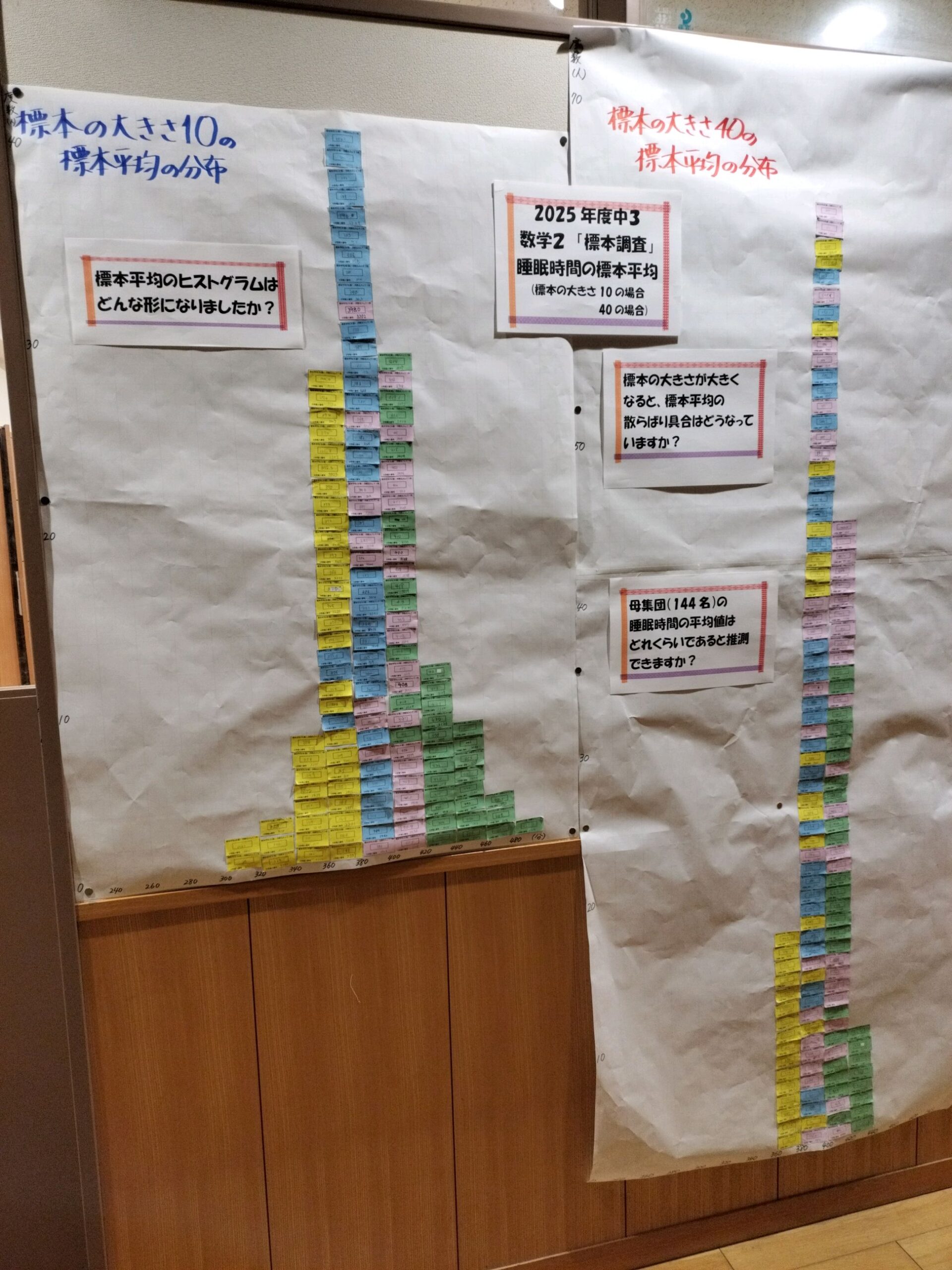 そこから標本の平均を求め、その平均を書いたカードを、目盛りをつけた模造紙に貼り付け、大きなヒストグラムを作りました。