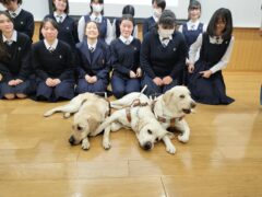 高等科3年生の希望者が、アイメイト(盲導犬)体験を行いました。公益財団法人アイメイト協会の指導員の方々と盲導犬3匹が来校してくれました。目の見えない方への手助けをするときに「手を取ってもよいですか?」と声を掛けたり、「時計の〇時の方向へ進みます。」などイメージしやすい言葉で誘導するなど、具体的な助言をいただき、生徒たちはさっそく実践してみました。目隠しをした盲人役の生徒と、介助役の生徒二人一組で、障害物のある道を進む練習もしました。目隠しをするだけで不安になり、まっすぐに歩くのも難しい様子でした。その後、一人ずつ目隠しをして、盲導犬のハーネスを握って歩行練習を行いました。「思ったよりも盲導犬が歩くのが速く感じた。」「肩の力を抜くのが難しかった。」などの感想が聞かれました。