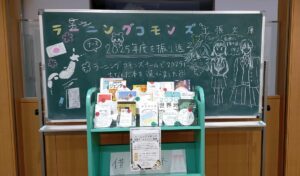 2025年度もいよいよ締めくくりの季節。現在、中学2年生の廊下では、ラコモンチームによる「出張文庫」と「黒板アート」の展示が行われています。